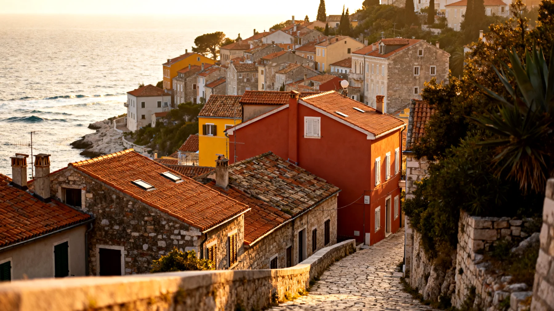 Der erste Spaziergang durch Rovinjs Altstadt sollte ohne konkreten Plan erfolgen. Sich im Gewirr der steilen Gassen zu verlieren, gehört zum Erlebnis. Die Architektur erzählt von der jahrhundertelangen venezianischen Herrschaft: bunte Hausfassaden, kleine Plätze mit Brunnen, überdachte Durchgänge und versteckte Innenhöfe. Der Aufstieg zur Kirche der Heiligen Euphemia auf dem höchsten Punkt der Halbinsel ist obligatorisch. Von dort oben bietet sich ein Panoramablick über die gesamte Bucht, die vorgelagerten Inseln und das adriatische Meer – besonders eindrucksvoll kurz vor Sonnenuntergang, wenn das Licht weich und golden wird.